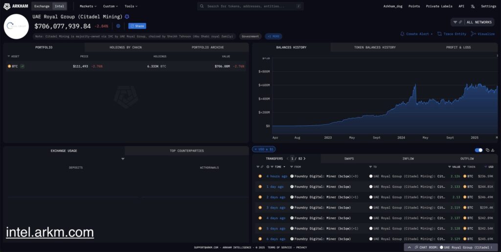Arkham Intelligence recently revealed that the United Arab Emirates (UAE) reportedly holds around 6,300 BTC, valued at nearly $700 million. These Bitcoin holdings are said to have been accumulated primarily through mining operations rather than direct purchases from the open market. This makes the UAE one of the notable state-level entities involved in Bitcoin mining and holding significant reserves.