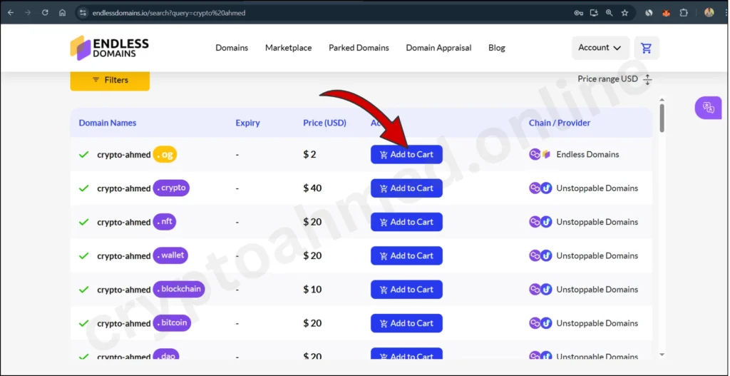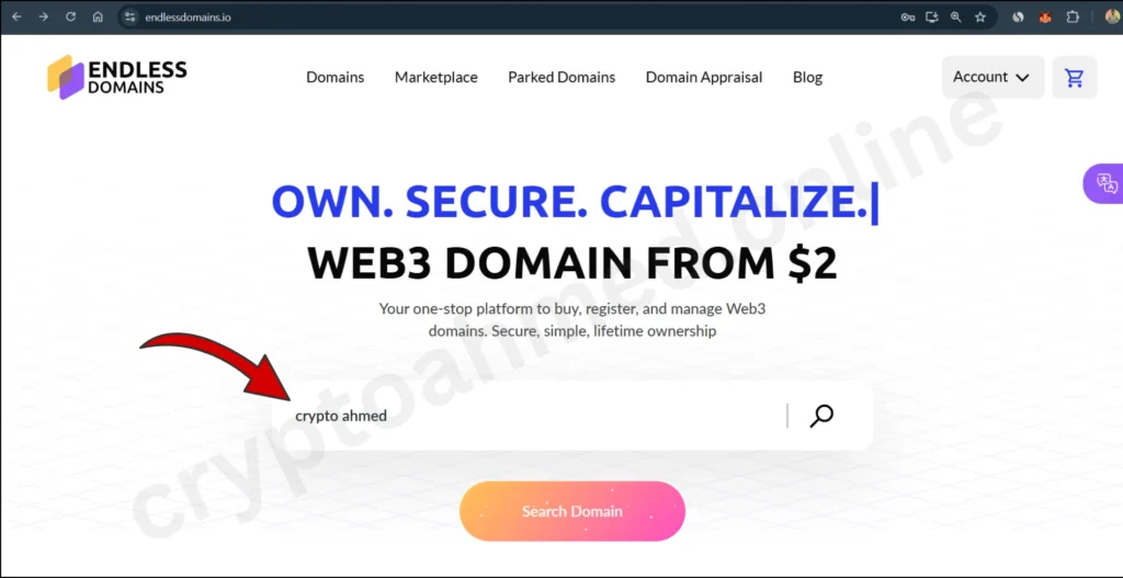 After creating your account, search for the domain name you want. In my case, I searched for “cryptoahmed”, as shown in the screenshot below.