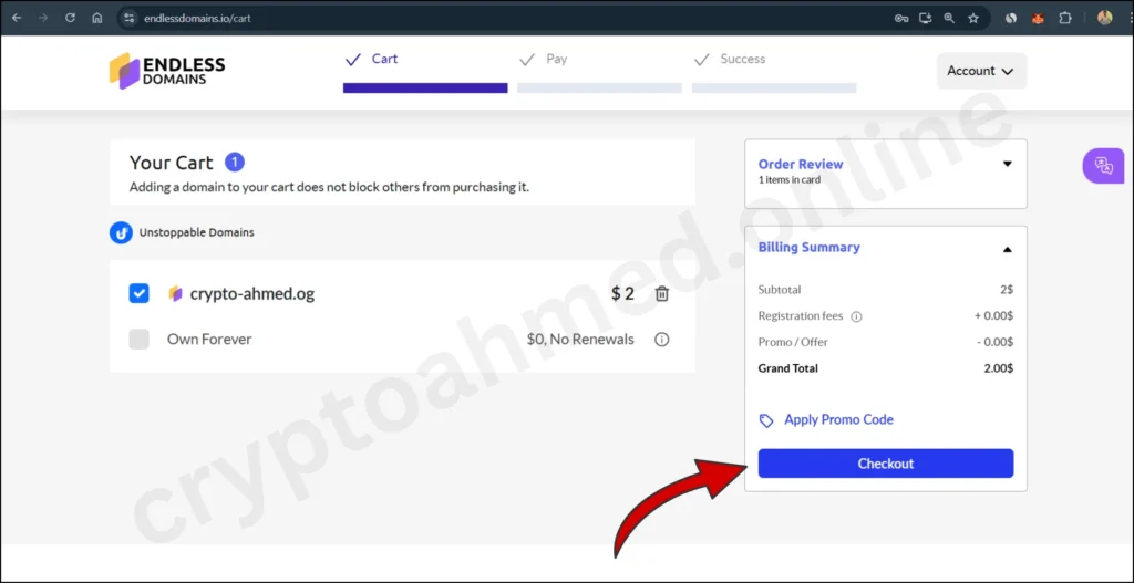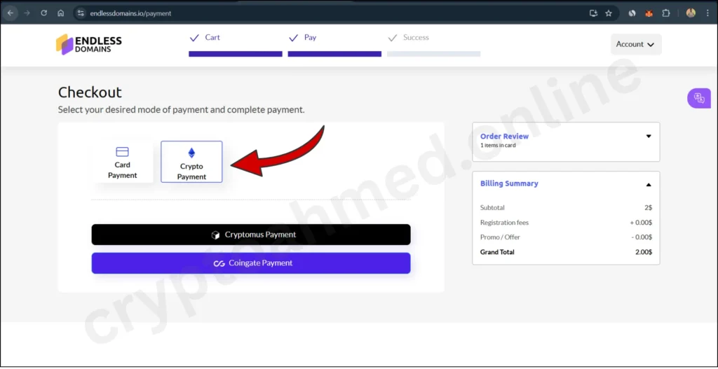 Next, choose your payment method. There are two options available: card payment, which is the most common, and crypto payment. I chose the crypto payment option because it’s more secure.