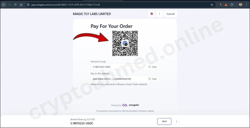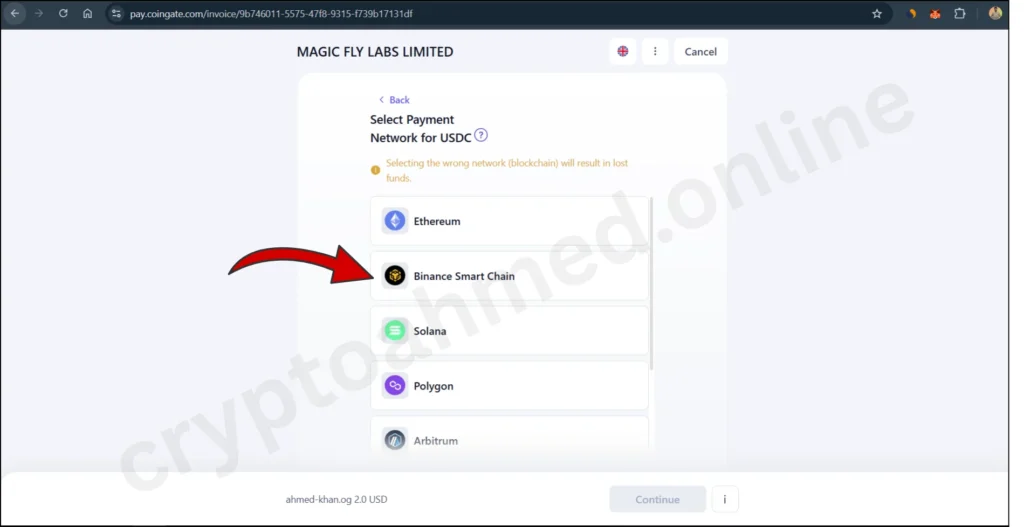 Next, select the network for your USDC payment. I chose the Binance Smart Chain (BSC) network. This step is very important—make sure you select the correct network. If you send the payment using a different chain, your funds will be permanently lost, and there’s no way to recover them.