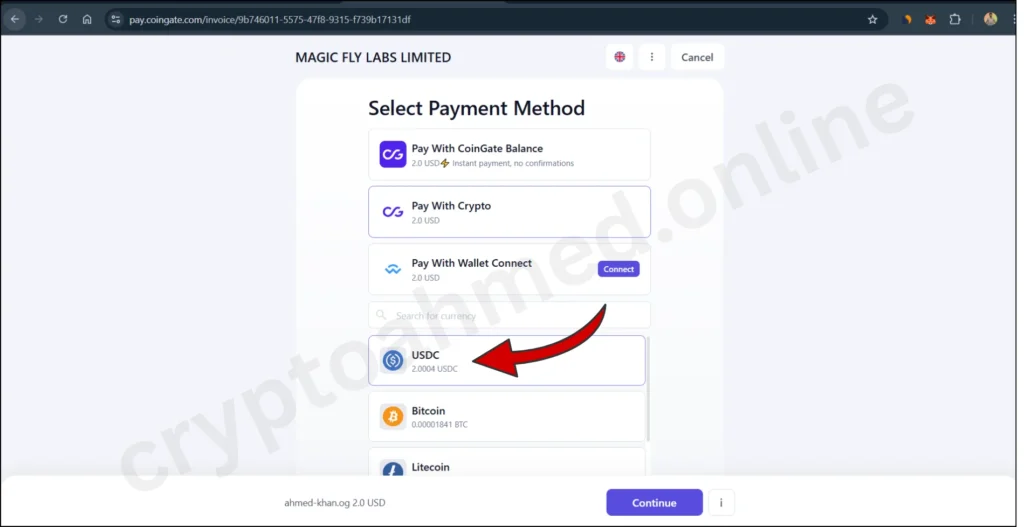 Please select a coin for payment. I selected USDC because it is equal to 1 US dollar. You can also select BTC or another coin.