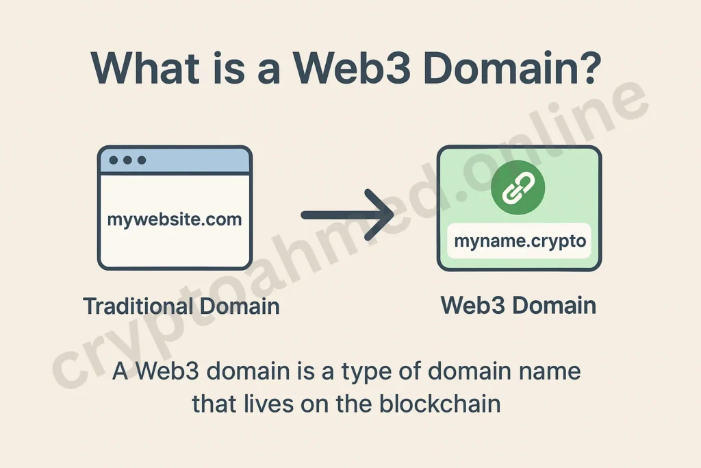 Let’s say your Web3 domain is ahmed.crypto. Someone could send you cryptocurrency just by using that name—no long wallet address needed. You can also link it to your decentralized website or use it to log in to Web3 apps securely.
